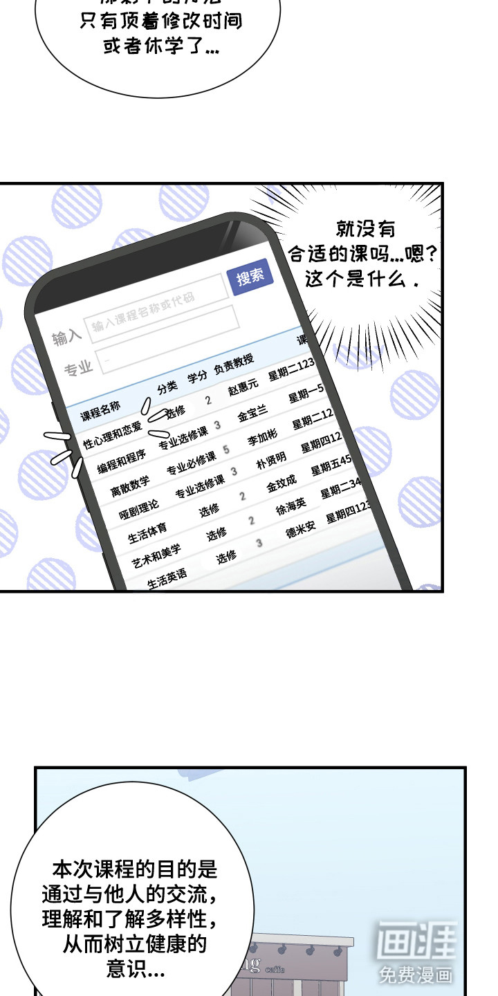 徐恩亚从小就表现出对姜以灿的兴趣,长大后也向他告了白。姜以灿为了躲开徐恩亚去了部队。没想到复学后两人在同一个班遇见。姜以灿为了修学分报了很多选修课,其中有一节爱情讲座。姜以灿决定推荐给徐恩亚,想要扭转他的恋爱……