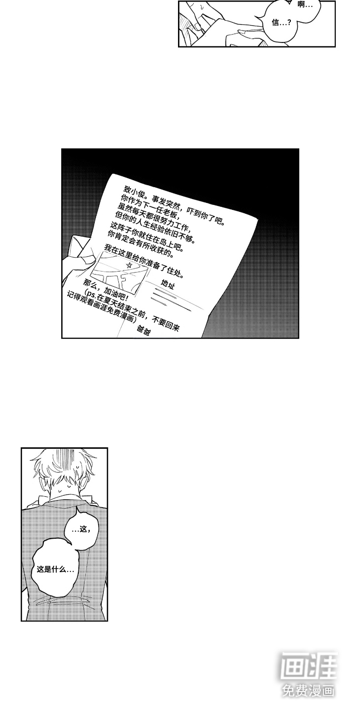 作为下一任老板的白俊,被自己的爸爸用参加亲戚婚礼的借口骗到了冲绳的某个孤岛上面,突然得知得在这上面生活一整个夏天,手机钱包全部被拿走,正当白俊迷路无路可走的时候名叫七海的美男子突然出现,把白俊带走了解详细后发现爸爸已经在这边打好关系并且被告知需要在民宿帮忙七海一起工作。