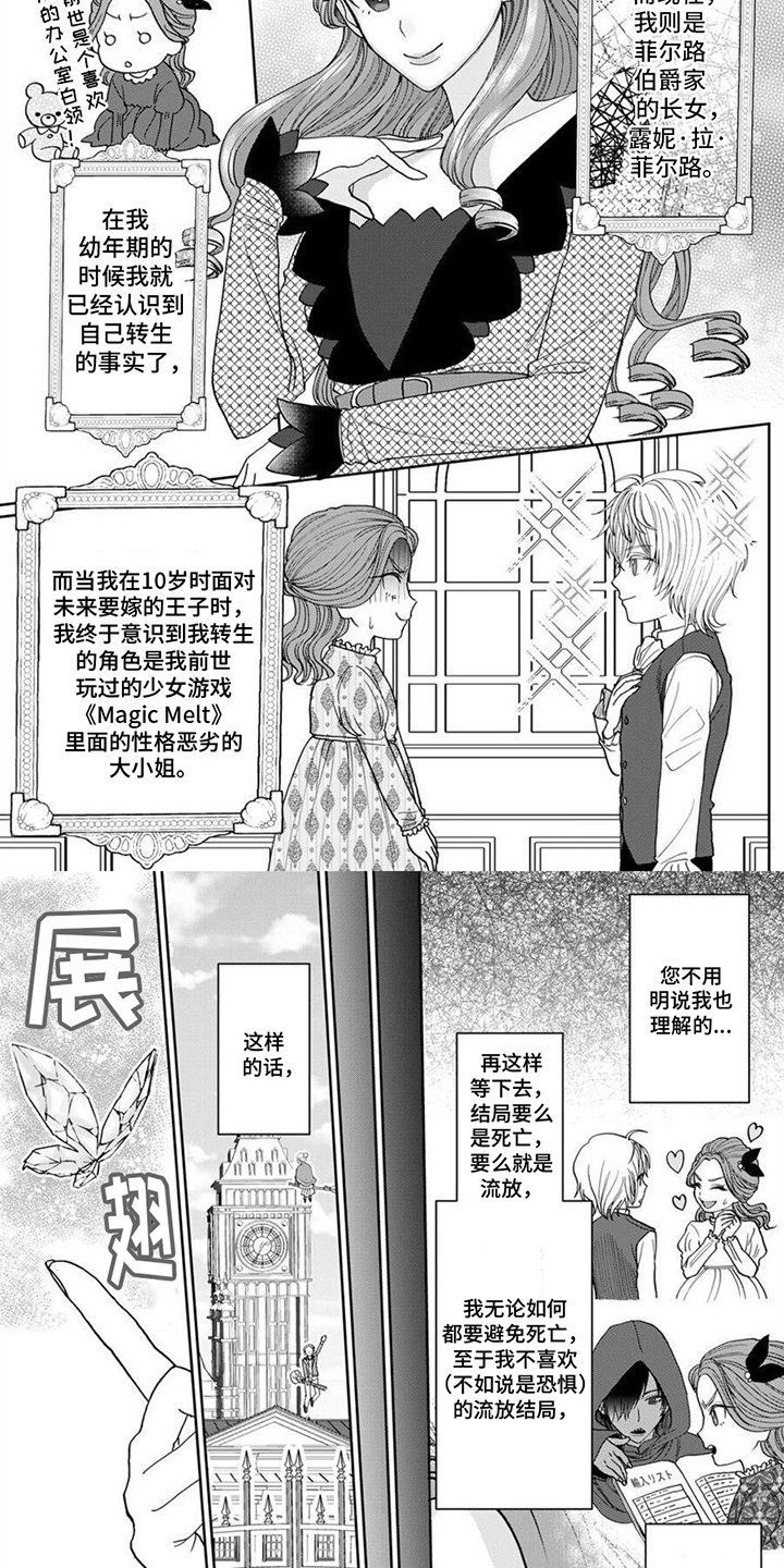 她前世是喜欢少女游戏的办公室文员,现世转生成为了少女游戏《Magic Melt》里面性格恶劣的大小姐。为了生存下去,她决定利用前世的知识来拔除各种死亡flag,避免走向破灭的结局。